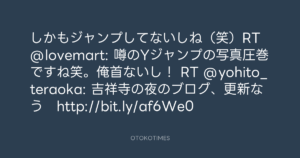 しかもジャンプしてないしね(笑)RT @lovemart: 噂のYジャンプの写真圧巻ですね笑。俺首ないし! RT @yohito_teraoka: 吉祥寺の夜のブログ、更新なう http://bit.ly/af6We0
