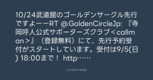 10/24武道館のゴールデンサークル先行ですよーーRT @GoldenCircleJp: 『寺岡呼人公式サポーターズクラブ<callman>』(登録無料)にて、先行予約受付がスタートしています。受付は9/5(日) 18:00まで! http://bit.ly/a7pn3o