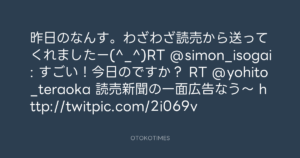昨日のなんす。わざわざ読売から送ってくれましたー(^_^)RT @simon_isogai: すごい!今日のですか? RT @yohito_teraoka 読売新聞の一面広告なう〜 http://twitpic.com/2i069v