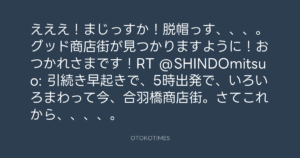 寺岡呼人 @yohito_teraoka – 8:57・2010年8月30日 2010 8/30 寺岡呼人 2010-08-30 えええ!まじっすか!脱帽っす、、、。グッド商店街が見つかりますように!おつかれさまです!RT @SHINDOmitsuo: 引続き早起きで、5時出発で、いろいろまわって今、合羽橋商店街。さてこれから、、、、。 Source:https://x.com/yohito_teraoka/status/22478239302 text X Post 寺岡呼人 寺岡呼人 この記事が気に入ったら フォローしてね! Follow @OtokoTimes1988 よかったらシェアしてね! URLをコピーしました! 寺岡呼人 @yohito_teraoka - 0:44・2010年8月30日 寺岡呼人 @yohito_teraoka - 14:13・2010年8月30日 関連記事 Artist 寺岡呼人 1968.02.07