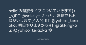 hello!の凱旋ライブについていきます(>_<)RT @soleilyt: えっと、宮崎でもおねがいします(^人^) RT @yohito_teraoka: 明日やりますがなRT @akkingkou: @yohito_teraoka 今度はぜひ大阪でもライブやってください