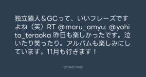 寺岡呼人 @yohito_teraoka – 21:07・2010年9月2日 2010 9/02 寺岡呼人 2010-09-02 独立猿人&GCって、いいフレーズですよね(笑)RT @maru_amyu: @yohito_teraoka 昨日も楽しかったです。泣いたり笑ったり。アルバムも楽しみにしています。11月も行きます! Source:https://x.com/yohito_teraoka/status/22792328026 text X Post 寺岡呼人 寺岡呼人 この記事が気に入ったら フォローしてね! Follow @OtokoTimes1988 よかったらシェアしてね! URLをコピーしました! 寺岡呼人 @yohito_teraoka - 19:17・2010年9月2日 寺岡呼人 @yohito_teraoka - 22:31・2010年9月2日 関連記事 Artist 寺岡呼人 1968.02.07