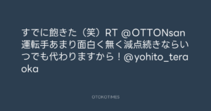 寺岡呼人 @yohito_teraoka – 11:19・2010年9月3日 2010 9/03 寺岡呼人 2010-09-03 すでに飽きた(笑)RT @OTTONsan 運転手あまり面白く無く減点続きならいつでも代わりますから!@yohito_teraoka Source:https://x.com/yohito_teraoka/status/22851240163 text X Post 寺岡呼人 寺岡呼人 この記事が気に入ったら フォローしてね! Follow @OtokoTimes1988 よかったらシェアしてね! URLをコピーしました! 寺岡呼人 @yohito_teraoka - 11:16・2010年9月3日 寺岡呼人 @yohito_teraoka - 11:33・2010年9月3日 関連記事 Artist 寺岡呼人 1968.02.07