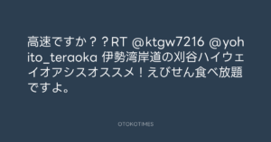 高速ですか??RT @ktgw7216 @yohito_teraoka 伊勢湾岸道の刈谷ハイウェイオアシスオススメ!えびせん食べ放題ですよ。