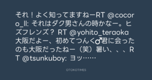 それ!よく知ってますねーRT @cocoro_ll: それはダク男さんの時かなー。ヒズフレンズ? RT @yohito_teraoka 大阪だよー、初めてつんく♂君に会ったのも大阪だったねー(笑)暑い、、、RT @tsunkuboy: ヨッヒーも大阪なんやね。あ、俺は、東京也。