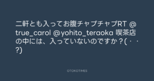 寺岡呼人 @yohito_teraoka – 15:20・2010年9月4日 2010 9/04 寺岡呼人 2010-09-04 二軒とも入ってお腹チャプチャプRT @true_carol @yohito_teraoka 喫茶店の中には、入っていないのですか?(・・?) Source:https://x.com/yohito_teraoka/status/22955392813 text X Post 寺岡呼人 寺岡呼人 この記事が気に入ったら フォローしてね! Follow @OtokoTimes1988 よかったらシェアしてね! URLをコピーしました! 寺岡呼人 @yohito_teraoka - 15:19・2010年9月4日 寺岡呼人 @yohito_teraoka - 15:36・2010年9月4日 関連記事 Artist 寺岡呼人 1968.02.07