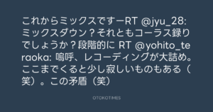 これからミックスですーRT @jyu_28: ミックスダウン?それともコーラス録りでしょうか?段階的に RT @yohito_teraoka: 嗚呼、レコーディングが大詰め。ここまでくると少し寂しいものもある(笑)。この矛盾(笑)