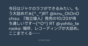 今日はジャケのラフができるみたい。もう大詰めだぁ(^_^)RT @kinu_OtOnOchizu: 『独立猿人』発売の10/20が待ち遠しいです~(^O^) RT @yohito_teraoka: 嗚呼、レコーディングが大詰め。ここまでくると少し寂しいものもある(笑)。
