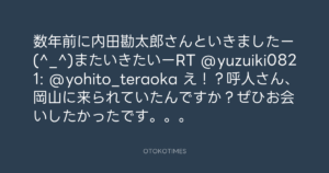 寺岡呼人 @yohito_teraoka – 23:56・2010年9月9日 2010 9/09 寺岡呼人 2010-09-09 数年前に内田勘太郎さんといきましたー(^_^)またいきたいーRT @yuzuiki0821: @yohito_teraoka え!?呼人さん、岡山に来られていたんですか?ぜひお会いしたかったです。。。 Source:https://x.com/yohito_teraoka/status/24016604203 text X Post 寺岡呼人 寺岡呼人 この記事が気に入ったら フォローしてね! Follow @OtokoTimes1988 よかったらシェアしてね! URLをコピーしました! 寺岡呼人 @yohito_teraoka - 23:45・2010年9月9日 寺岡呼人 @yohito_teraoka - 0:31・2010年9月10日 関連記事 Artist 寺岡呼人 1968.02.07