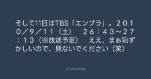 寺岡呼人 @yohito_teraoka – 0:47・2010年9月10日 2010 9/10 寺岡呼人 2010-09-10 そして11日はTBS「エンプラ」。2010/9/11(土) 26:43~27:13(※放送予定) ええ、まぁ恥ずかしいので、見ないでください(笑) Source:https://x.com/yohito_teraoka/status/24021100255 text X Post 寺岡呼人 寺岡呼人 この記事が気に入ったら フォローしてね! Follow @OtokoTimes1988 よかったらシェアしてね! URLをコピーしました! 寺岡呼人 @yohito_teraoka - 0:31・2010年9月10日 寺岡呼人 @yohito_teraoka - 0:49・2010年9月10日 関連記事 Artist 寺岡呼人 1968.02.07