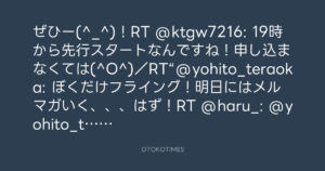 ぜひー(^_^)!RT @ktgw7216: 19時から先行スタートなんですね!申し込まなくては(^O^)/RT“@yohito_teraoka: ぼくだけフライング!明日にはメルマガいく、、、はず!RT @haru_: @yohito_teraoka ソロツアー!!
