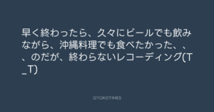 早く終わったら、久々にビールでも飲みながら、沖縄料理でも食べたかった、、、のだが、終わらないレコーディング(T_T)