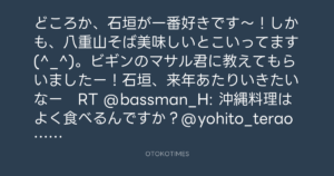 どころか、石垣が一番好きです〜!しかも、八重山そば美味しいとこいってます(^_^)。ビギンのマサル君に教えてもらいましたー!石垣、来年あたりいきたいなー RT @bassman_H: 沖縄料理はよく食べるんですか?@yohito_teraoka