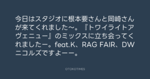 寺岡呼人 @yohito_teraoka – 16:23・2010年9月13日 2010 9/13 寺岡呼人 2010-09-13 今日はスタジオに根本要さんと岡崎さんが来てくれました〜。『トワイライトアヴェニュー』のミックスに立ち会ってくれましたー。feat.K、RAG FAIR、DWニコルズですよーー。 Source:https://x.com/yohito_teraoka/status/24362923771 text X Post 寺岡呼人 寺岡呼人 この記事が気に入ったら フォローしてね! Follow @OtokoTimes1988 よかったらシェアしてね! URLをコピーしました! 寺岡呼人 @yohito_teraoka - 1:15・2010年9月13日 寺岡呼人 @yohito_teraoka - 16:28・2010年9月13日 関連記事 Artist 寺岡呼人 1968.02.07