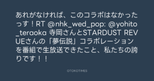 あれがなければ、このコラボはなかったっす!RT @nhk_wed_pop: @yohito_teraoka 寺岡さんとSTARDUST REVUEさんの「夢伝説」コラボレーションを番組で生放送できたこと、私たちの誇りです!!