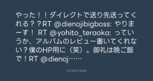 やった!!ダイレクトで送り先送ってくれる??RT @dienojibigboss: やりまーす! RT @yohito_teraoka: っていうか、アルバムのレビュー書いてくれない?僕のHP用に(笑)。御礼は晩ご飯で!RT @dienojibigboss: