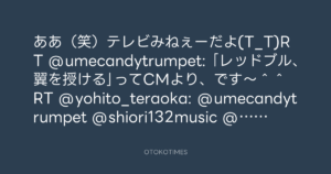 ああ(笑)テレビみねぇーだよ(T_T)RT @umecandytrumpet: 「レッドブル、翼を授ける」ってCMより、です〜^^ RT @yohito_teraoka: @umecandytrumpet @shiori132music @ssssssaori