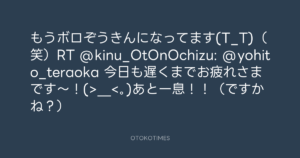 もうボロぞうきんになってます(T_T)(笑)RT @kinu_OtOnOchizu: @yohito_teraoka 今日も遅くまでお疲れさまです~!(>_<。)あと一息!!(ですかね?)