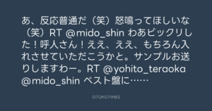 あ、反応普通だ(笑)怒鳴ってほしいな(笑)RT @mido_shin わあビックリした!呼人さん!ええ、ええ、もちろん入れさせていただこうかと。サンプルお送りしますわー。RT @yohito_teraoka @mido_shin ベスト盤にか『母さん』入りますか?