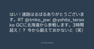 はい!遠路はるばるありがとうございます。RT @tmko_jsw: @yohito_teraoka GCに北海道から参戦します。3時間超え!? 今から鍛えておかないと(笑)