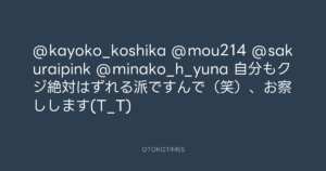 寺岡呼人 @yohito_teraoka – 22:35・2010年9月18日 2010 9/18 寺岡呼人 2010-09-18 @kayoko_koshika @mou214 @sakuraipink @minako_h_yuna 自分もクジ絶対はずれる派ですんで(笑)、お察しします(T_T) Source:https://x.com/yohito_teraoka/status/24848499456 text X Post 寺岡呼人 寺岡呼人 この記事が気に入ったら フォローしてね! Follow @OtokoTimes1988 よかったらシェアしてね! URLをコピーしました! 寺岡呼人 @yohito_teraoka - 22:27・2010年9月18日 寺岡呼人 @yohito_teraoka - 22:41・2010年9月18日 関連記事 Artist 寺岡呼人 1968.02.07