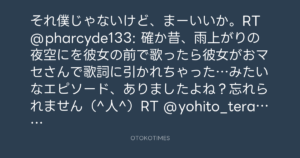 それ僕じゃないけど、まーいいか。RT @pharcyde133: 確か昔、雨上がりの夜空にを彼女の前で歌ったら彼女がおマセさんで歌詞に引かれちゃった…みたいなエピソード、ありましたよね?忘れられません(^人^)RT @yohito_teraoka