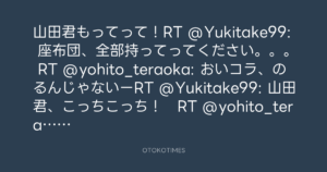 山田君もってって!RT @Yukitake99: 座布団、全部持ってってください。。。 RT @yohito_teraoka: おいコラ、のるんじゃないーRT @Yukitake99: 山田君、こっちこっち! RT @yohito_teraoka: 座布団二枚(笑点)