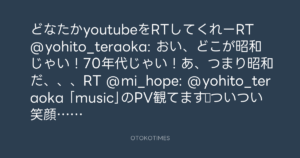 どなたかyoutubeをRTしてくれーRT @yohito_teraoka: おい、どこが昭和じゃい!70年代じゃい!あ、つまり昭和だ、、、RT @mi_hope: @yohito_teraoka 「music」のPV観てます♪ついつい笑顔になっちゃいます。昭和な感じもいいです