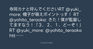 寺岡カナと呼んでくださいRT @yuki_more: 帽子が萌えポイントっす! RT @yohito_teraoka: きた!僕が監督してますなう!「3,2,1,どーぞ!」RT @yuki_more: @yohito_teraoka http://bit.ly/9Vzk0c