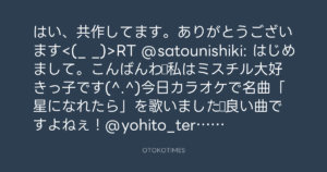 はい、共作してます。ありがとうございます<(_ _)>RT @satounishiki: はじめまして。こんばんわ☆私はミスチル大好きっ子です(^.^)今日カラオケで名曲「星になれたら」を歌いました♪良い曲ですよねぇ!@yohito_teraoka
