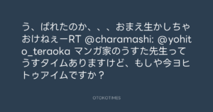 う、ばれたのか、、、おまえ生かしちゃおけねぇーRT @charamashi: @yohito_teraoka マンガ家のうすた先生ってうすタイムありますけど、もしや今ヨヒトゥアイムですか?