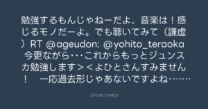 勉強するもんじゃねーだよ、音楽は!感じるモノだーよ。でも聴いてみて(謙虚)RT @ageudon: @yohito_teraoka 今更ながら・・・これからもっとジュンスカ勉強します><よひとさんすみません! 一応過去形じゃあないですよね・・・?(笑9