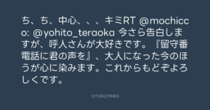 寺岡呼人 @yohito_teraoka – 23:29・2010年9月18日 2010 9/18 寺岡呼人 2010-09-18 ち、ち、中心、、、キミRT @mochicco: @yohito_teraoka 今さら告白しますが、呼人さんが大好きです。『留守番電話に君の声を』、大人になった今のほうが心に染みます。これからもどぞよろしくです。 Source:https://x.com/yohito_teraoka/status/24852394236 text X Post 寺岡呼人 寺岡呼人 この記事が気に入ったら フォローしてね! Follow @OtokoTimes1988 よかったらシェアしてね! URLをコピーしました! 寺岡呼人 @yohito_teraoka - 23:28・2010年9月18日 寺岡呼人 @yohito_teraoka - 23:31・2010年9月18日 関連記事 Artist 寺岡呼人 1968.02.07
