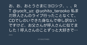 お、お、おとうさまにヨロシク、、、RT @yaclt_yz: @yohito_teraoka 私まだ呼人さんのライブ行ったことなくて、CDでしのいできた身なんで申し訳ないですけど、お父さんが呼人さんに似てました!呼人さんのことずっと大好きです!