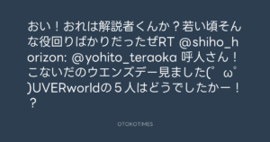 おい!おれは解説者くんか?若い頃そんな役回りばかりだったぜRT @shiho_horizon: @yohito_teraoka 呼人さん!こないだのウエンズデー見ました(゜ω゜)UVERworldの5人はどうでしたかー!?