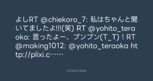 よしRT @chiekoro_7: 私はちゃんと聞いてましたよ!!!(笑) RT @yohito_teraoka: 言ったよー、プンプン(T_T)!RT @making1012: @yohito_teraoka http://plixi.com/p/46337212