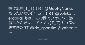 情け無用(T_T)!RT @GooPyNana: もったいない(´;ω;`) RT @yohito_teraoka: あほ、この間でフォロワー激減したんだよ、プンプン(T_T)!つぶやきすぎたRT @rie_sparkle: @yohito_teraoka えー!これから今夜も