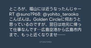 ところが、福山には近うなったんじゃーRT @suno1968: @yohito_teraoka こんばんは。Golden Circleに伺おうと思っているのですが、翌日は地元に帰って仕事なんです…広島空港から広島市内まで、もっと近くなりませんかぁ?