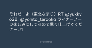 寺岡呼人 @yohito_teraoka – 23:04・2010年9月21日 2010 9/21 寺岡呼人 2010-09-21 それだーよ(東北なまり)RT @yukky628: @yohito_teraoka ライナーノーツ楽しみにしてるので早く仕上げてくださーい♪ Source:https://x.com/yohito_teraoka/status/25121328043 text X Post 寺岡呼人 寺岡呼人 この記事が気に入ったら フォローしてね! Follow @OtokoTimes1988 よかったらシェアしてね! URLをコピーしました! 寺岡呼人 @yohito_teraoka - 23:03・2010年9月21日 寺岡呼人 @yohito_teraoka - 23:05・2010年9月21日 関連記事 Artist 寺岡呼人 1968.02.07