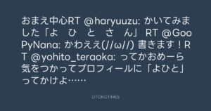 おまえ中心RT @haryuuzu: かいてみました「よ ひ と さ ん」 RT @GooPyNana: かわええ(//ω//) 書きます!RT @yohito_teraoka: ってかおめーら気をつかってプロフィールに「よひと」ってかけよなー、プンプン(T_T)!ガラガラ!