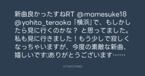新曲良かったすねRT @mamesuke18 @yohito_teraoka 「横浜」で、もしかしたら見に行くのかな? と思ってました。私も見に行きました!もう少しで寂しくなっちゃいますが、今度の素敵な新曲、嬉しいです♪ありがとうございます。