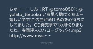 ちゅーーーしん!RT @tomo0501: @yohito_teraoka いち早く聴けてちょー嬉しいです♪この曲が聴けるのを心待ちにしてました。CD発売まで1カ月切りましたね。寺岡呼人のハローグッバイ.mp3 http://www.myspace.com/music/18765820/songs/74103353/?ap=1&sms_ss=twitter via @AddThis
