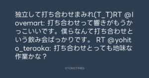 独立して打ち合わせまみれ(T_T)RT @lovemart: 打ち合わせって響きがもうかっこいいです。僕らなんて打ち合わせという飲み会ばっかりです。 RT @yohito_teraoka: 打ち合わせとっても地味な作業かな?