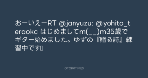 寺岡呼人 @yohito_teraoka – 0:35・2010年9月25日 2010 9/25 寺岡呼人 2010-09-25 おーいえーRT @janyuzu: @yohito_teraoka はじめましてm(__)m35歳でギター始めました。ゆずの『贈る詩』練習中です♪ Source:https://x.com/yohito_teraoka/status/25414635755 text X Post 寺岡呼人 寺岡呼人 この記事が気に入ったら フォローしてね! Follow @OtokoTimes1988 よかったらシェアしてね! URLをコピーしました! 寺岡呼人 @yohito_teraoka - 0:13・2010年9月25日 寺岡呼人 @yohito_teraoka - 0:39・2010年9月25日 関連記事 Artist 寺岡呼人 1968.02.07