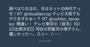 調べはりなはれ、今はネットの時代でっせ!RT @doublecrop テレビ大阪でもやりますかぁ~? RT @yohito_teraoka: 間違い! テレビ東京の『音流』10/22出演決定‼ 司会の怒髪天の増子さん、優しかった〜。ふぅ〜(^ー^)