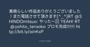 素晴らしい作品ありがとうございました!また電話させて頂きます(^_^)RT @SHINDOmitsuo: やった~‼ YEAH! RT @yohito_teraoka プロモ完成!!!!!!! http://bit.ly/ainKxP