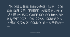 「独立猿人発売 前前々夜祭」決定!2010年10月17日(日曜日)枚数限定のライブ!問 MUSIC CAFE SO-SO http://bit.ly/9FJROZ 04-2966-1036チケット予約 9/26 21:00より メール予約のみの受付!