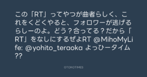 この「RT」ってやつが曲者らしく、これをくどくやると、フォロワーが逃げるらしーのよ。どう?合ってる?だから「RT」をなしにするぜよRT @MihoMyLife: @yohito_teraoka よっひータイム??