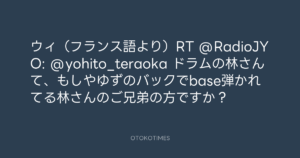 寺岡呼人 @yohito_teraoka – 23:25・2010年9月26日 2010 9/26 寺岡呼人 2010-09-26 ウィ(フランス語より)RT @RadioJYO: @yohito_teraoka ドラムの林さんて、もしやゆずのバックでbase弾かれてる林さんのご兄弟の方ですか? Source:https://x.com/yohito_teraoka/status/25594070259 text X Post 寺岡呼人 寺岡呼人 この記事が気に入ったら フォローしてね! Follow @OtokoTimes1988 よかったらシェアしてね! URLをコピーしました! 寺岡呼人 @yohito_teraoka - 23:24・2010年9月26日 寺岡呼人 @yohito_teraoka - 23:27・2010年9月26日 関連記事 Artist 寺岡呼人 1968.02.07