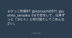 よひっこ所望RT @kamachi0511: @yohito_teraoka 小6で恋をして、以来ずっと「ヨヒト」と呼び捨てしてごめんなさい。